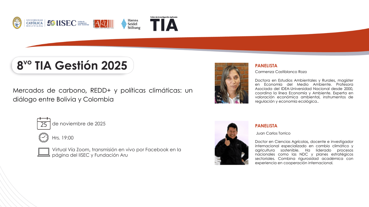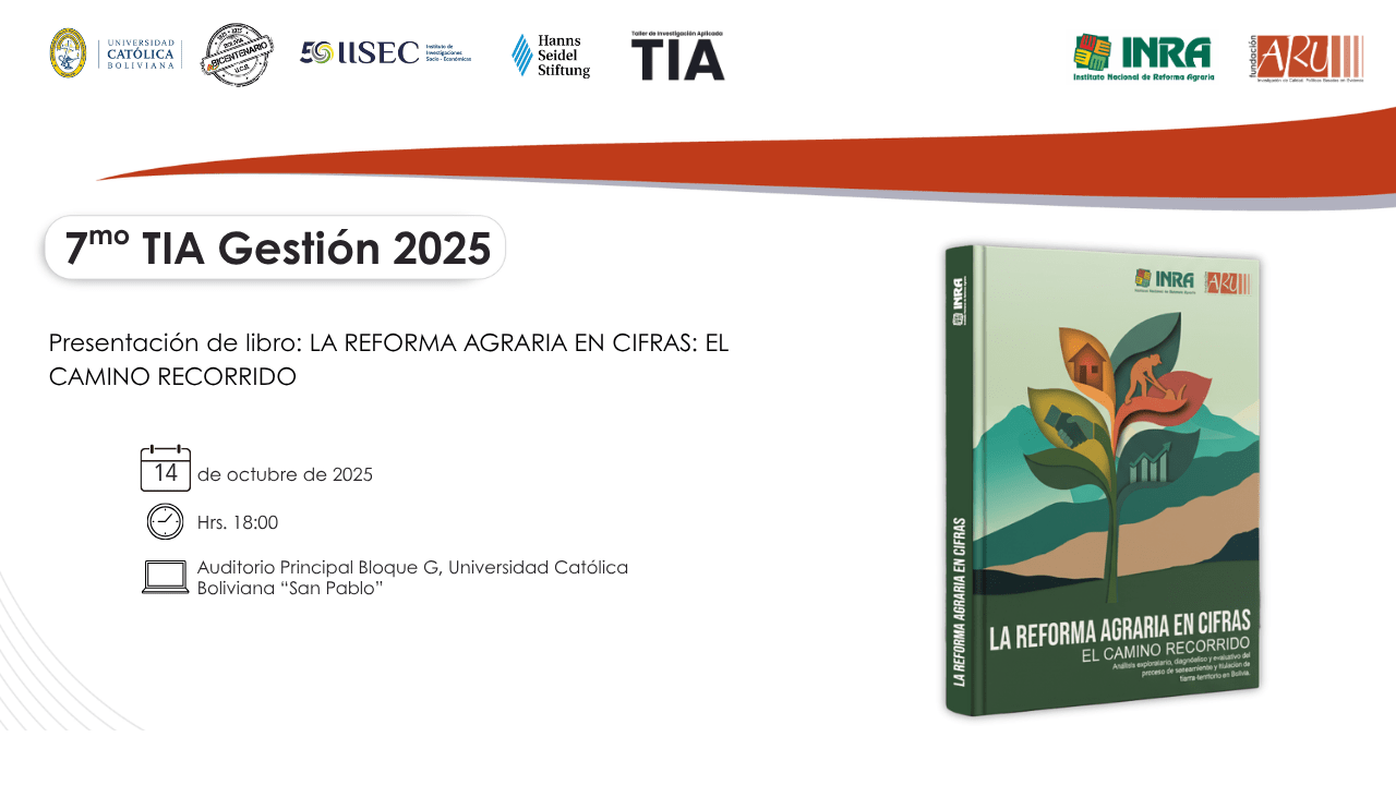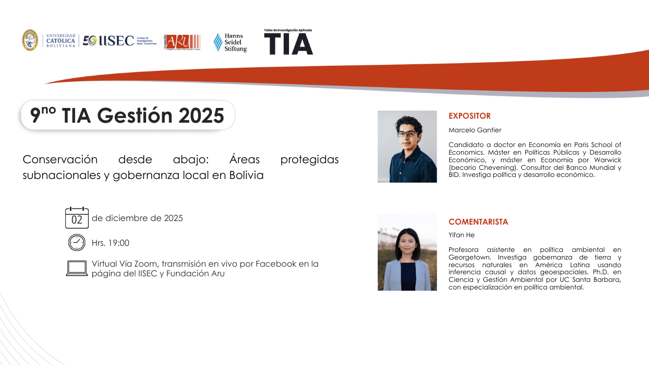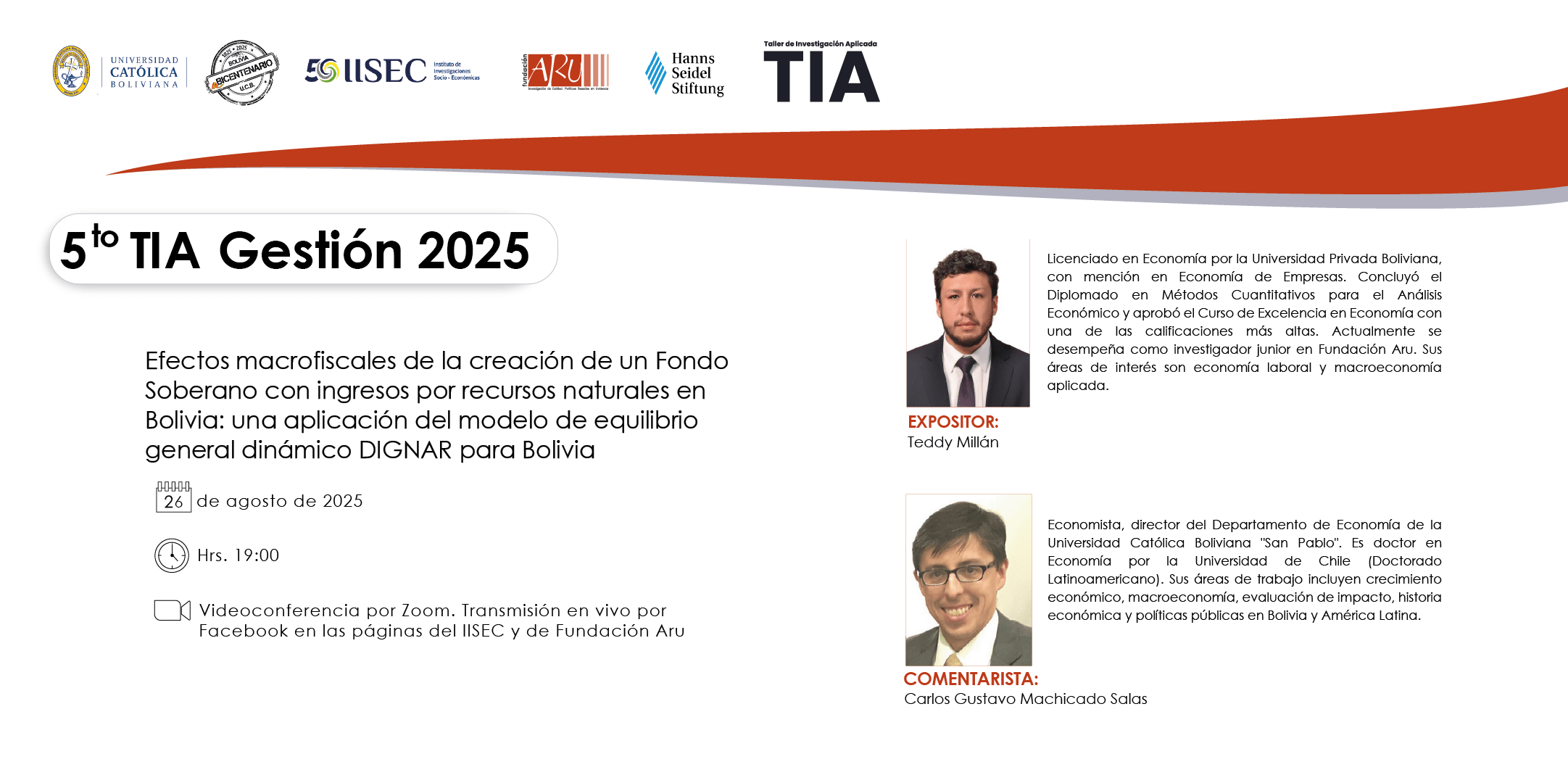 El Taller de Investigación Aplicada (TIA) es una iniciativa conjunta entre la Fundación Aru y el Instituto de Investigaciones Socio-Económicas de la Universidad Católica Boliviana “San Pablo” (IISEC – UCB). Fue diseñado para la presentación, análisis y debate sobre los resultados obtenidos en investigaciones preliminares o finales, sometidos a los criterios de expertos especializados según el área temática.